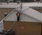 The overhead run was constructed from EMT conduits with service heads installed at the top on both sides being supported to (2) 2” RMC support poles fived to the adjacent buildings. The 3 conductors were pulled from the combiner box through the service head and on the other end from the DC disconnect to the service head with 3 feet of additional conductor to create a drip loop. A 66’ piece of aluminum triplex 4/0-4/0-4/0 was fastened to an Arlington 610 porcelain wire holder on each RMC support pole. The overhead conductors were spliced to the THWN feeder conductors using Ilsco PBT-250 insulated splice connections.