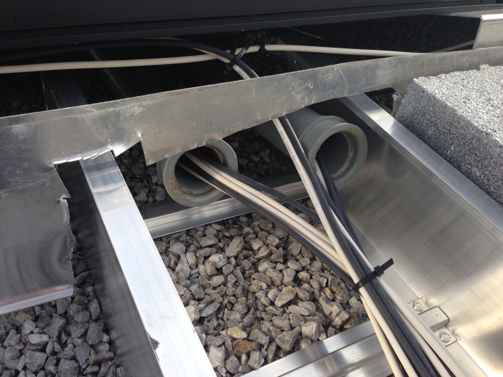 The sharp edges are certainly dangerous. But is it just the start of the dangerous cable tray installation at this site. As you can see in the 3 photos below, the tray is not secured or ballasted. There is even a ballast pan screwed to the tray, but with no ballast! Its just sitting there waiting to be blown off the roof during a windy storm. The three photos below may not have the shock value of the top photo, but these unsecured objects are a greater threat to life and property once they are ripped away and become airborne (tearing away live DC wiring with it).